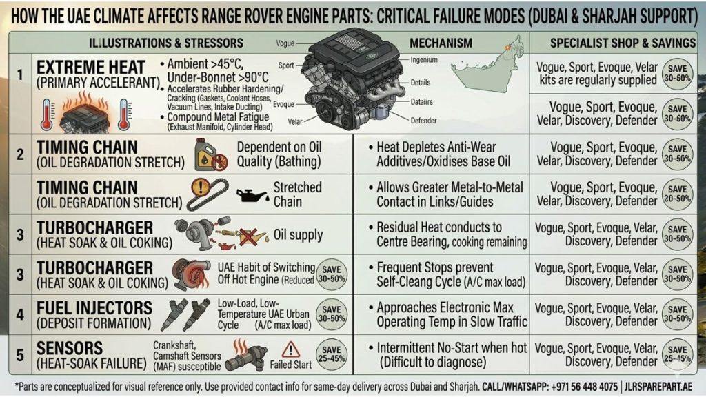 Crankshaft sensors, camshaft sensors, and mass airflow sensors are all susceptible to heat-soak failure in UAE conditions. The electronic components inside these sensors — particularly the Hall-effect elements in position sensors — have defined maximum operating temperatures that can be approached or exceeded during sustained slow traffic in summer. The resulting intermittent faults are among the most difficult to diagnose because they only present when the engine is at maximum thermal soak — typically not replicated in the workshop unless the vehicle is inspected immediately after a failed start event in summer conditions. Our range rover engine parts dubai stock covers all these sensor types for same-day delivery.