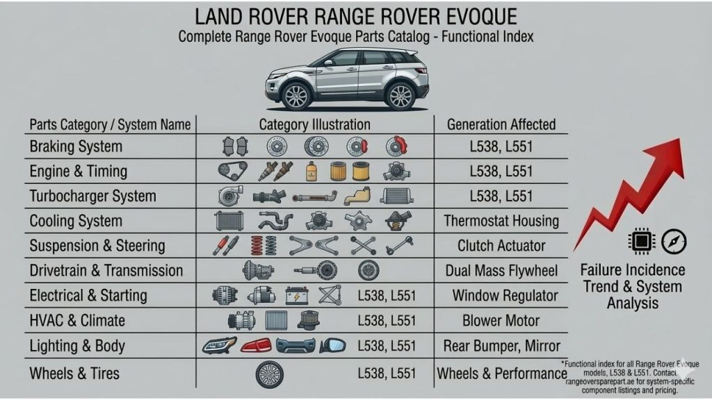 Our range rover evoque spare parts inventory at rangeroversparepart.ae covers every major system across both generations. Here is the full catalog by category.